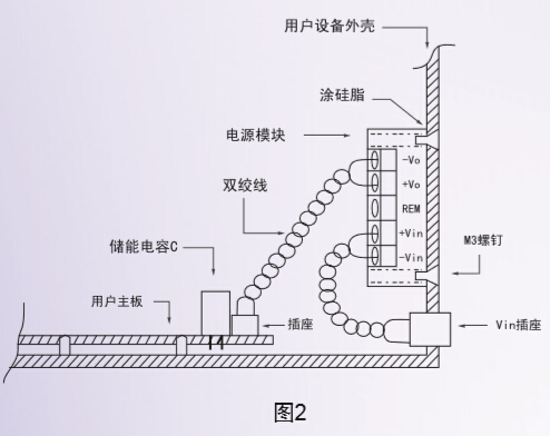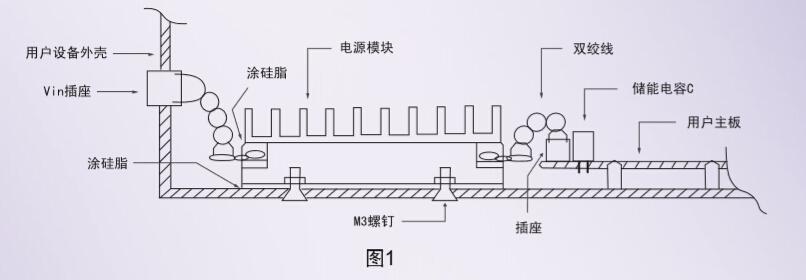2. 直接利用系統(tǒng)外殼散熱的裝配方式 若用戶系統(tǒng)中空間較小,可直接利用外殼散熱,如圖二所示,因模塊直接利用系統(tǒng)外殼散熱,所以一定要保證無 間隙裝配。