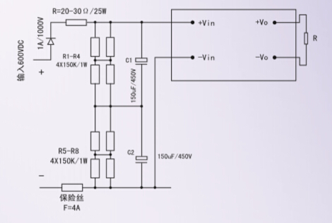 高壓600V輸入的電源模塊,希望用戶采用如下措施:1. 濾波電容的接入方法見圖