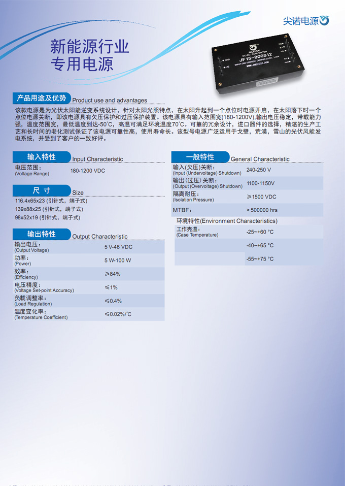 該款電源是為光伏太陽能逆變系統(tǒng)設(shè)計,針對太陽光照特點,在太陽升起到一個點位時電源開啟,在太陽落下時一個 點位電源關(guān)斷,即該電源具有欠壓保護和過壓保護裝置。該電源具有輸入范圍寬(180-1200V),輸出電壓穩(wěn)定,帶載能力 強,溫度范圍寬,低溫度到達-50℃,高溫可滿足環(huán)境溫度70℃。可靠的冗余設(shè)計,進口器件的選擇,精湛的生產(chǎn)工 藝和長時間的老化測試保證了該電源可靠性高,使用壽命長。該型號電源廣泛運用于戈壁,荒漠,雪山的光伏風能發(fā) 電系統(tǒng),并受到了客戶的一致好評