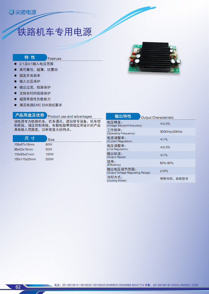 該電源專為鐵路機(jī)車,機(jī)車通訊,進(jìn)站信號(hào)設(shè)備,機(jī)車控 制系統(tǒng),液壓控制系統(tǒng),車載電腦等領(lǐng)域應(yīng)用設(shè)計(jì)的產(chǎn)品 具有輸入范圍寬,功率密度大的特點(diǎn)